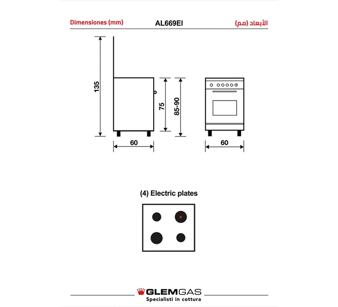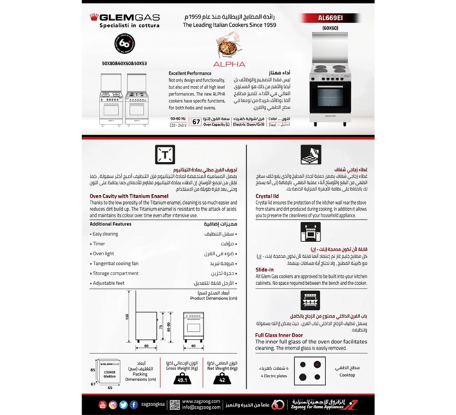 فرن جليم غاز (كهرباء) 60*60، 4 شعلات ـ أستيل AL669EI